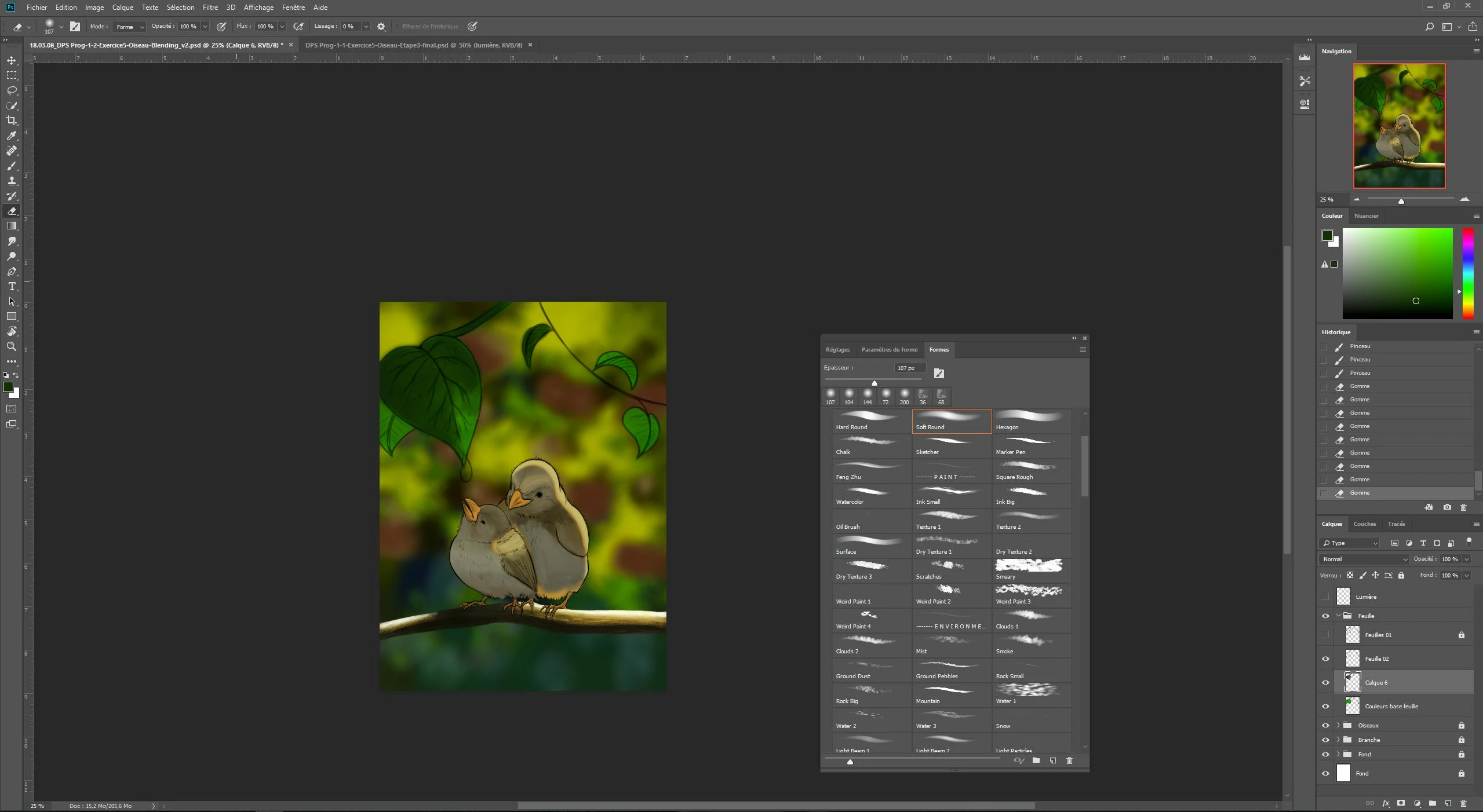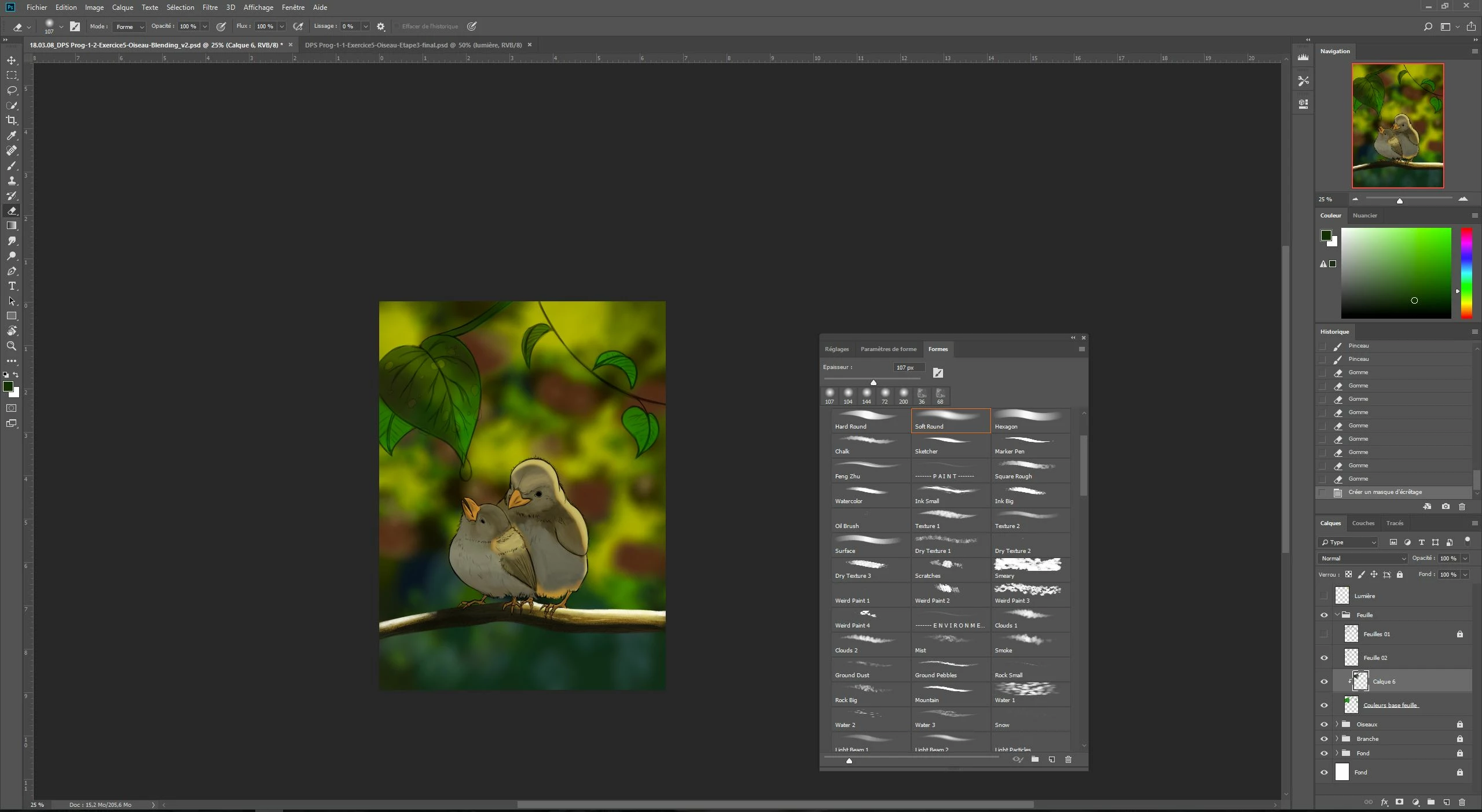 In this first capture, you can see the mask to do the shadows on the leaves is not clipped... Leaves, branch and birds are in separate groups. The colors of the branch and the birds were done using clipping mask:. One for the flat colors, and others clipped on the basic one for the effects. in the case of the bird and the branch, the clipping masks worked properly. However... the color problem restarted with the leaves...