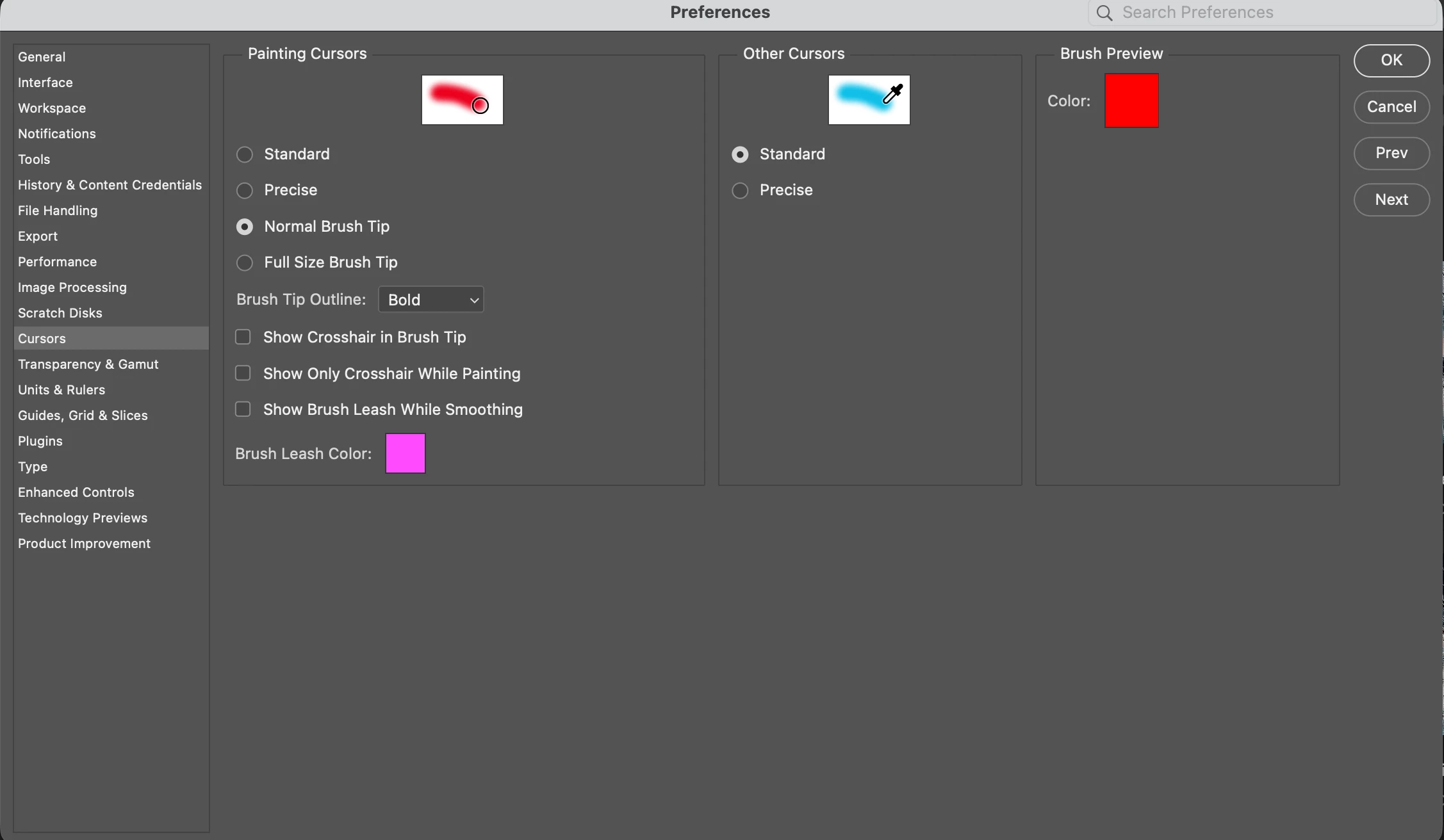 - Photoshop Cursor Preference is set to "Normal Brush Tip" and the cursor is set to "Standard"