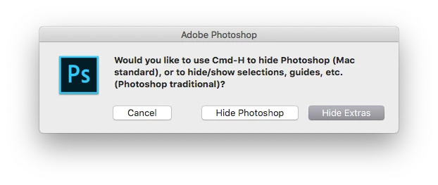 I'm wondering if there's any way to change back to CMD+H to hide Photoshop--I've been using it for, well, long enough for it to become engrained in my behavior, and there doesn't seem to be any way to change the "Photoshop" menu item in the latest CC version.