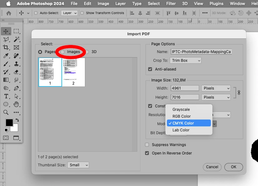cmyk pdf opens as grayscale in Photoshop