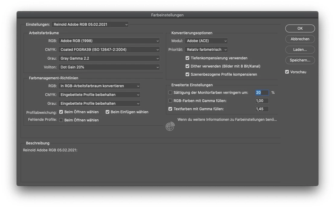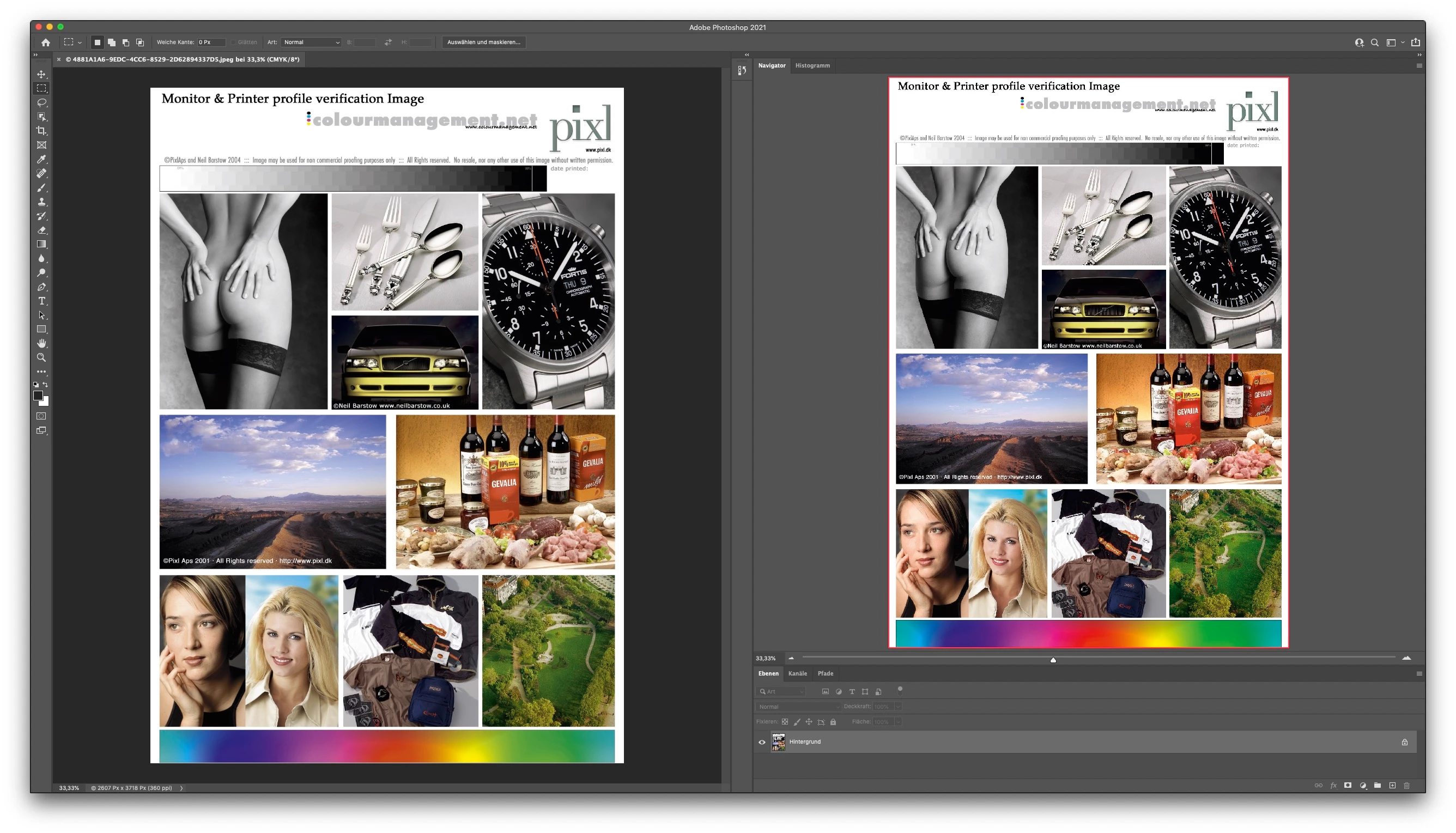 The colour management runs from the camera via LR or ACR to PS in Adobe RGB. My Eizo CS2731 is also set to Adobe RGB and hardware calibrated with Spider-x.