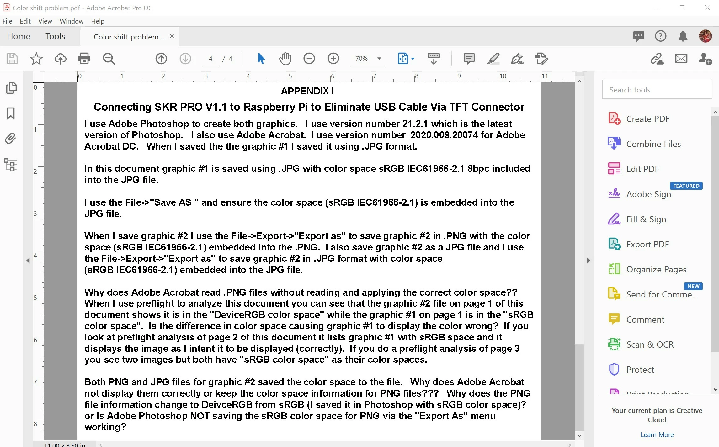 UPDATE: Guys, I created all the graphics in Photoshop. YES, I embedd the ICC profile in the PNG file via the EXPORT->EXPORT AS in Photoshop. YES, I physically check the box to embedded the ICC profile into the file. What I am saying is the Photoshop DOES NOT embedded the ICC file via EXPORT AS. If I use EXPORT->SAVE FOR WEB (legacy) and choose PNG-8 (NOT PNG-24) and check the box to save the ICC profile to the file the PNG will now save the ICC Profile to the PNG file. Why does it work with SAVE FOR WEB (legacy) but NOT EXPORT->EXPORT AS (If I choose PNG and check the box for embedd ICC Profile)?? Adobe acrobat must be using PNG-24 format when you select PNG from EXPORT->EXPORT AS because even with EXPORT->SAVE FOR WEB (legacy) and if you choose PNG-24 and embedd the ICC Profile the PNG-24 will NOT display correctly. THIS looks like a photoshop issue. Which PNG format is photoshop using (PNG-8 or PNG024) when you choose EXPORT-> EXPORT AS??