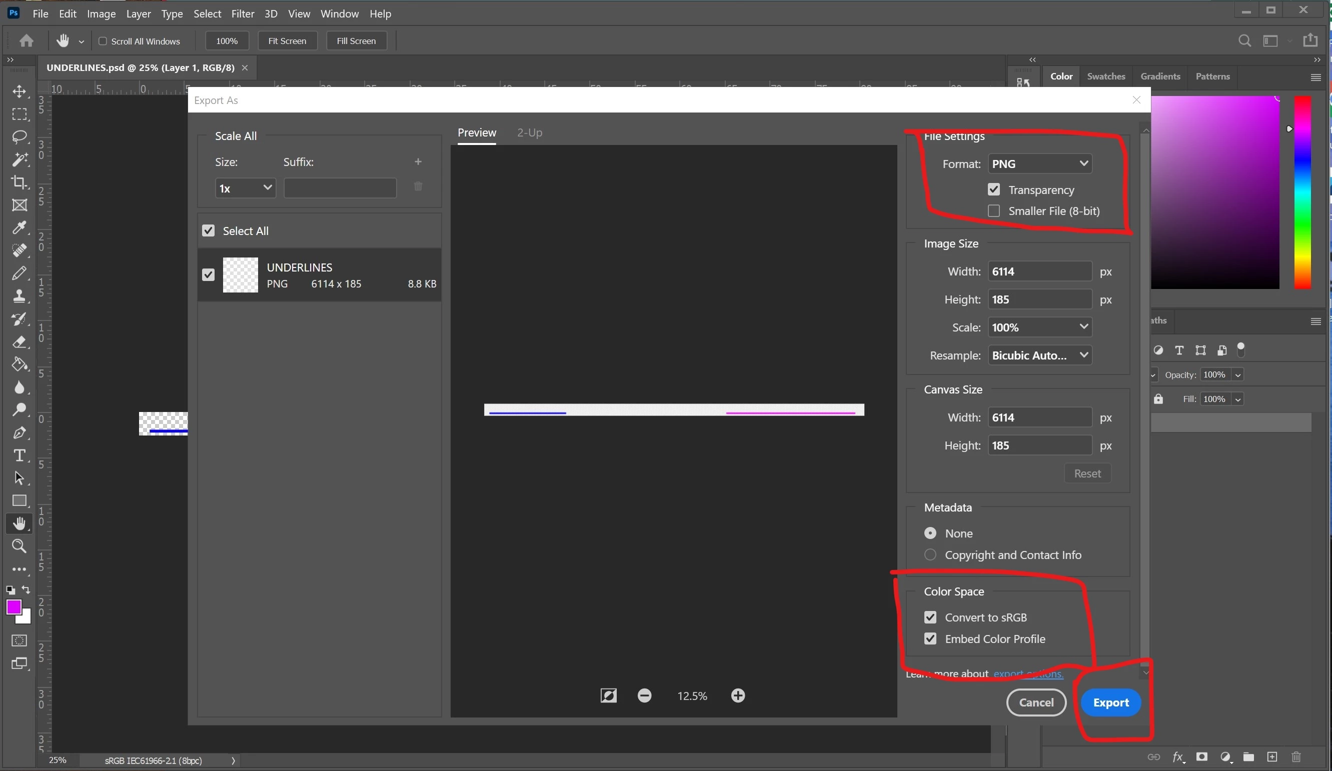 Here is the EXPORT->EXPORT AS screen for PNG format that I use that did not work: