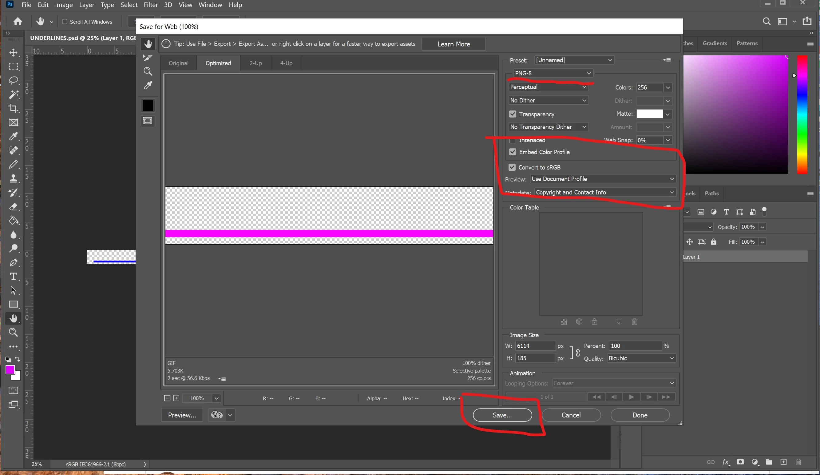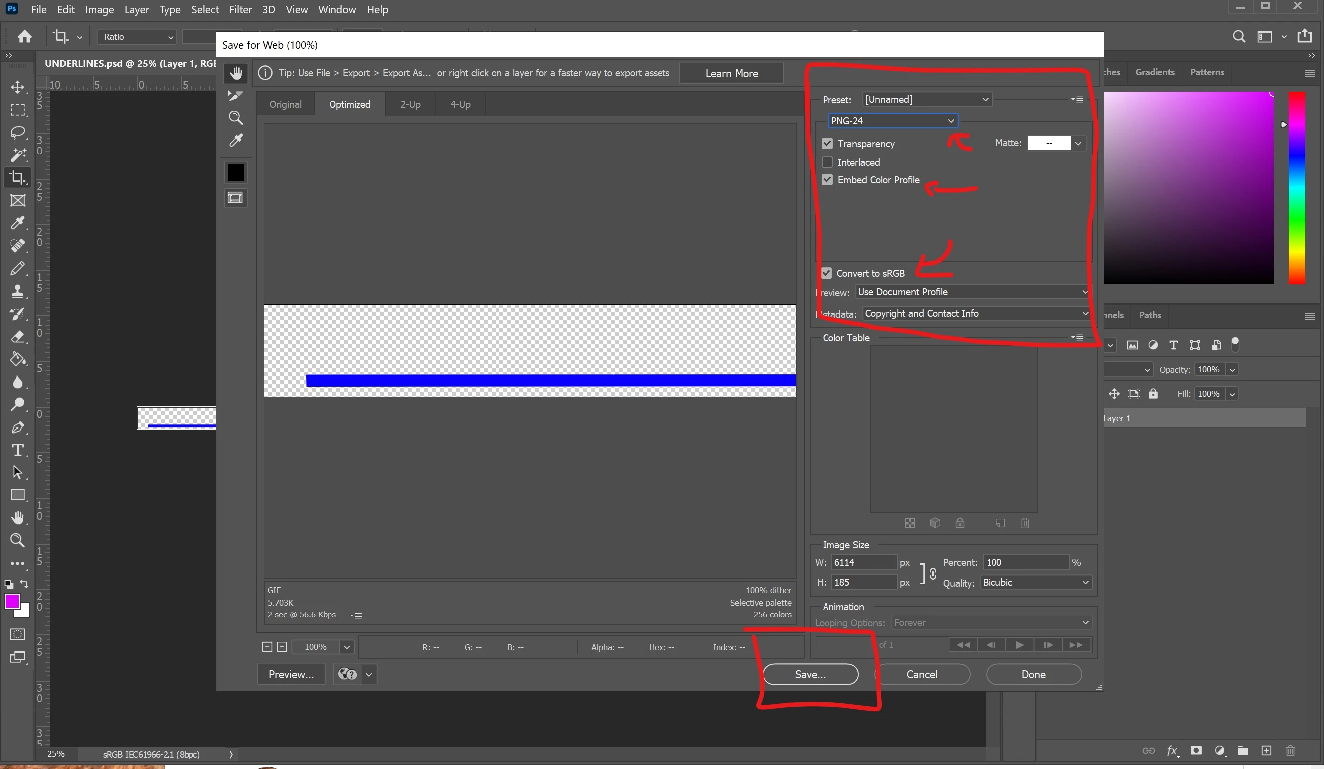 Here is the EXPORT->SAVE for WEB (legacy) ->PNG-24 screen for PNG format that I use that did not work: