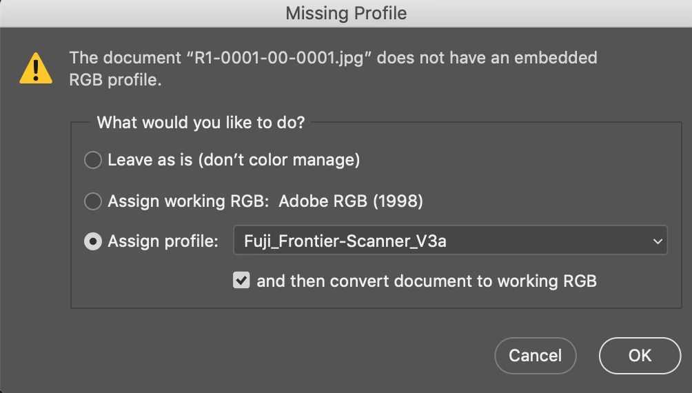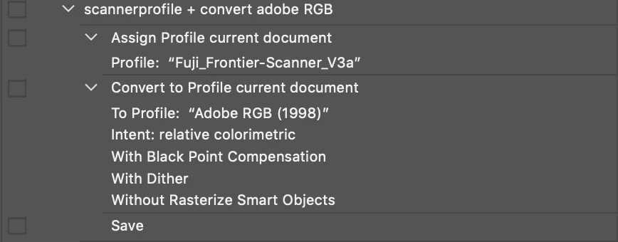 I usually work with a lot of files from my Fuji Scanner. The problem is that they come from the scanner without a color profile. To fix that I have downloaded a Fujiscanner color profile. When I open my files I assign the scanner profile and then convert it to Adobe RGB and then save. All good except it takes a lot of time but the images come out looking good and correct.