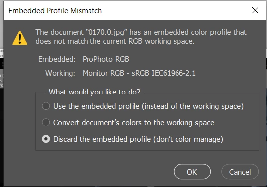 I have studied the Preferences in PS and can find no way to change the default which is to discard the embedded profile... I can open individual files (.dng and .jpg) from Lightroom Classic and for each one I must specify that I want to use the embedded profile. However, If I open a batch of files as layers in PS, either from Lightroom Classic OR by using the script available from the PS File menu, PS automatically discards the embedded profile and all of my development is lost. Is there a way to set a global preference to 'Use embedded profile'?