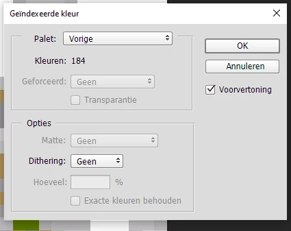 I am trying to convert my pixel art using a color palette of 184 colors, but I want to limit it to only 10 colors. I am using Adobe Photoshop CC 2014 in the Dutch language.
