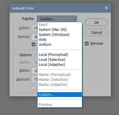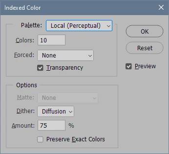 I have the color mode to RGB with a color depth of 8 bits per channel. I then tried to use the 'Indexed Color' option to select the 184-color palette and limit it to only 10 colors, And i dont know if it uses 10 colors?