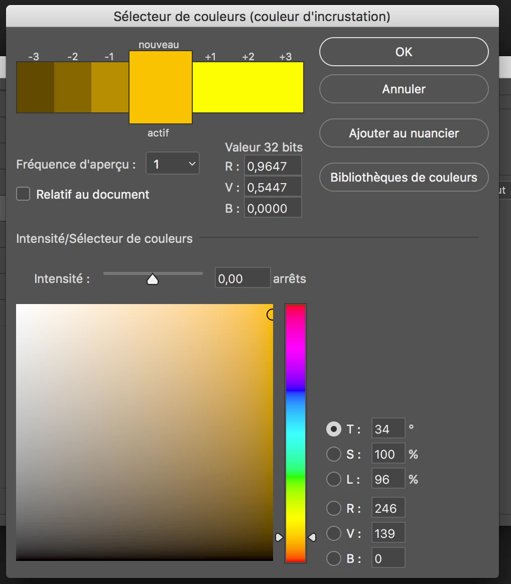 I have found that my .psd was in 32 BITS mode. So i have changed it to 16bits and now everything is fine with my color picker.