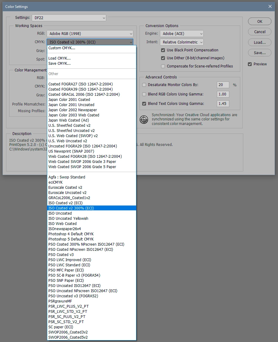 I'm having a problem with Photoshop, I can't find the color profile that I want to change the document to. The publishing company is asking for CMYK Coated Fogra 39, but there are very few options in the profile menu and none of them are that one. In previous versions, I didn't have any problems changing it from the Color Settings, but now it's not showing up.