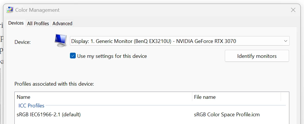 After doing some rearch on Google, I checked Color Management within Windows and the ICC Profile was blank at first until I added the sRGB 2.1 seen below.