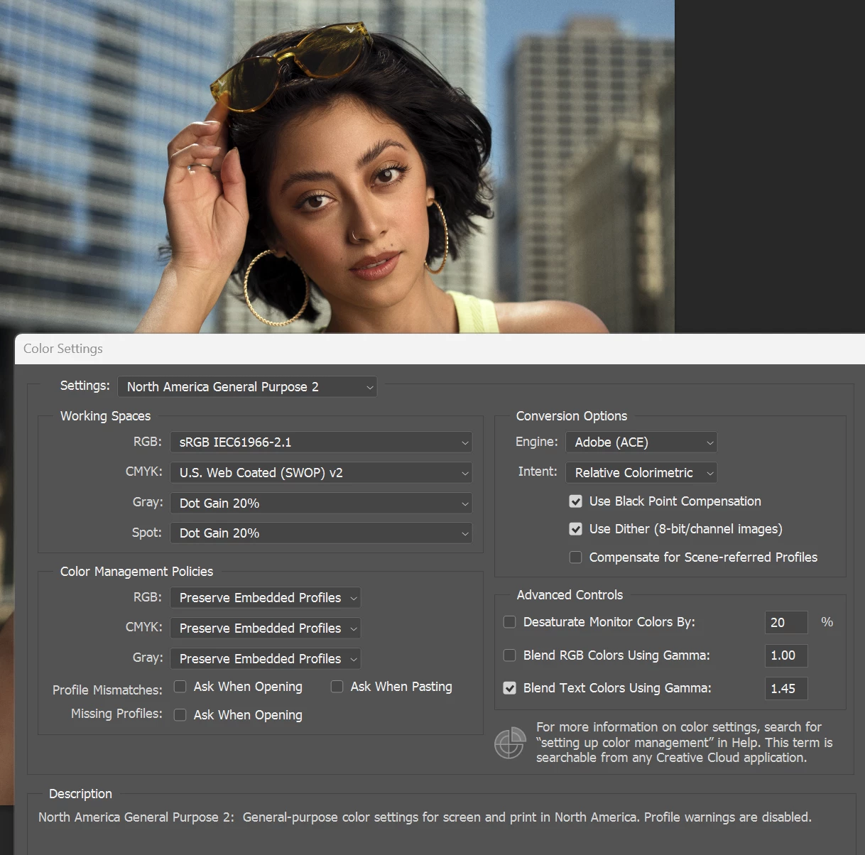 Below are the Color Settings I seen in Photoshop. I made no changes so these settings were the same before I noticed I had an issue.