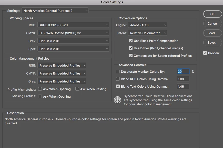 Hello! My camera is set to work in sRGB as well as my working space in PS. However, when I open an image in PS it says the color space is mismatched. The warning message says the document is embedded Adobe RGB. Whether I select to convert to working color space or to keep embedded color space my images turn out flat and greenish post processing. Why would PS say my images are Adobe RGB when they are actually sRGB???? Are there screen shots of exactly what my color space preferences should say?