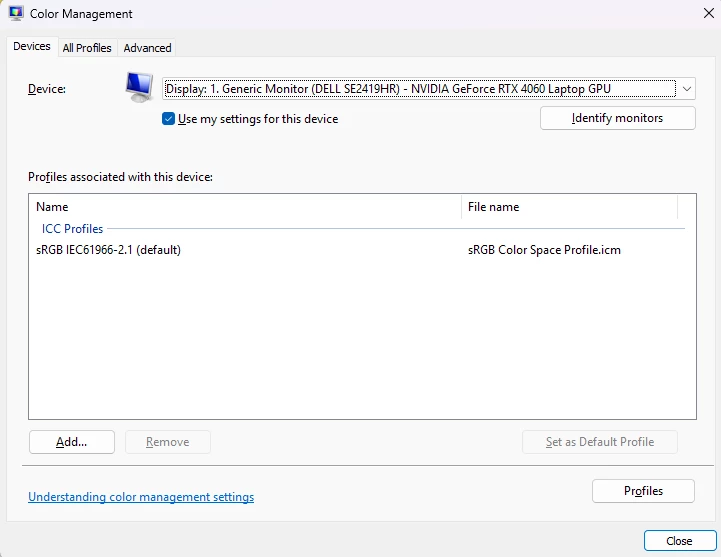 Additionally, if I press Win+P to bring up display settings and enable extended monitors, to extend my screen onto my Asus ROG Strix G16 laptop screen, suddenly the Dell monitor wakes up and shows accurate colors. The moment I disable the laptop screen, the Dell goes back to washed out colors.