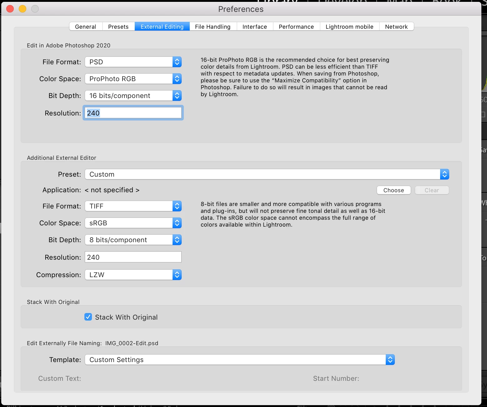 Lightroom is currently instructed to use the following details when editing externally in PS: