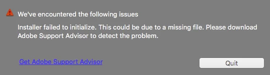 So I uninstall and attempted to run the installer and got this error message: "We have encounted the following issues. Installer failed to initialize. This could be due to a missing file. Please download Adobe Support Advisor to detect the problem." Then there is a link to get the Adobe Support Advisor. But when you click the link there is no file there. What gives with that? (also see attached screen grab)
