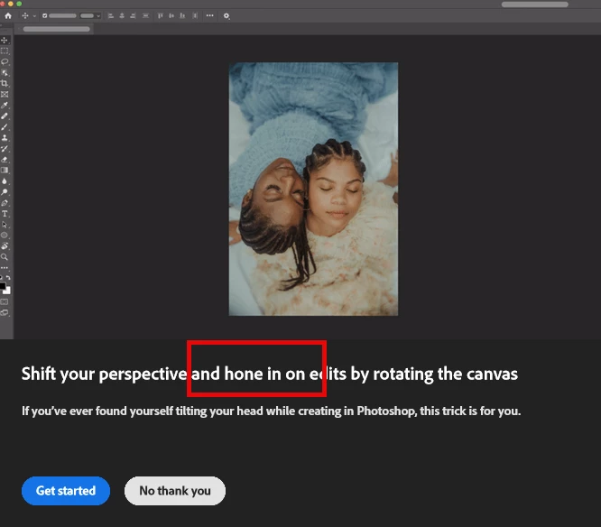 Open PS 2025 and dialog pops up, "Shift your perspective and hone in on edits by rotating the canvas."