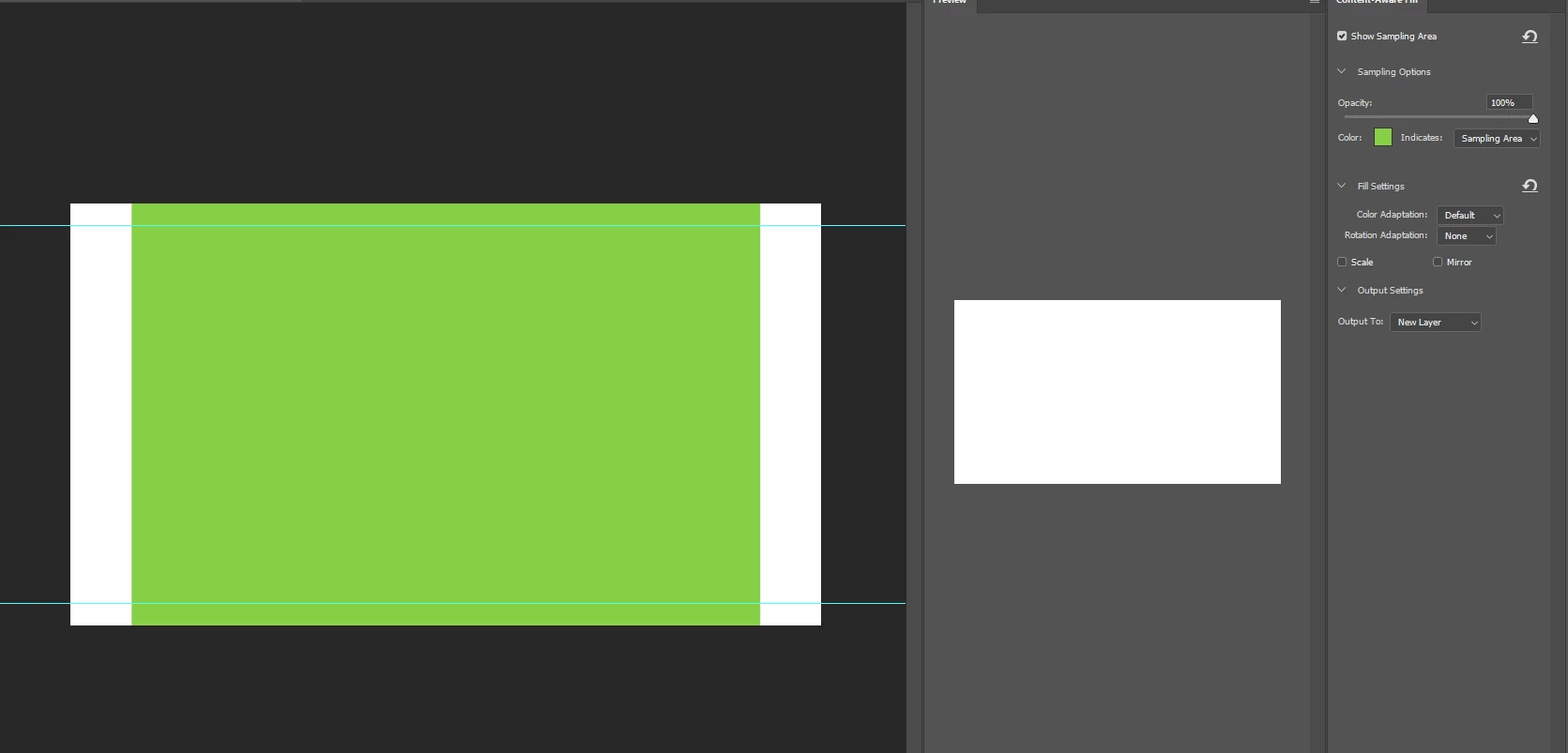 When I use the Content Aware Fill tool, sometimes it works, sometimes it doesn't at all. The photos attached show the photo I want to fill and what happens when I fill it. I get a blank, green image that seems to be loading, but it never loads.