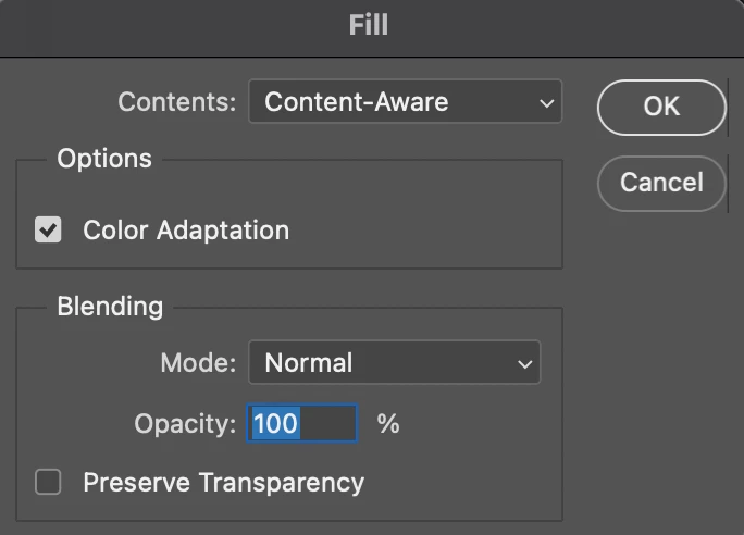 I am now using Photoshop 2021 version 22.3.0 on Mac OS and I don't know if there's some problem with the Content Aware Fill. In the previous version I used, I usually press Shift + Delete to show Content Aware Fill dialog box like this.