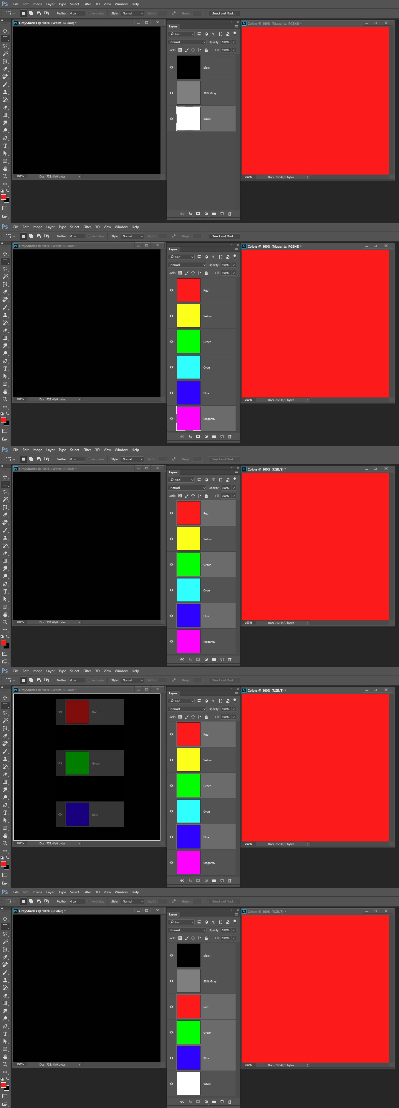 Here I create two 500px by 500px documents. In one I create three gray color layers in the other 6 Primary colors layers.