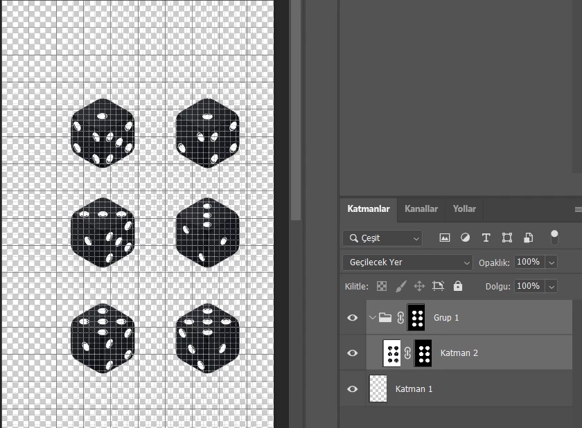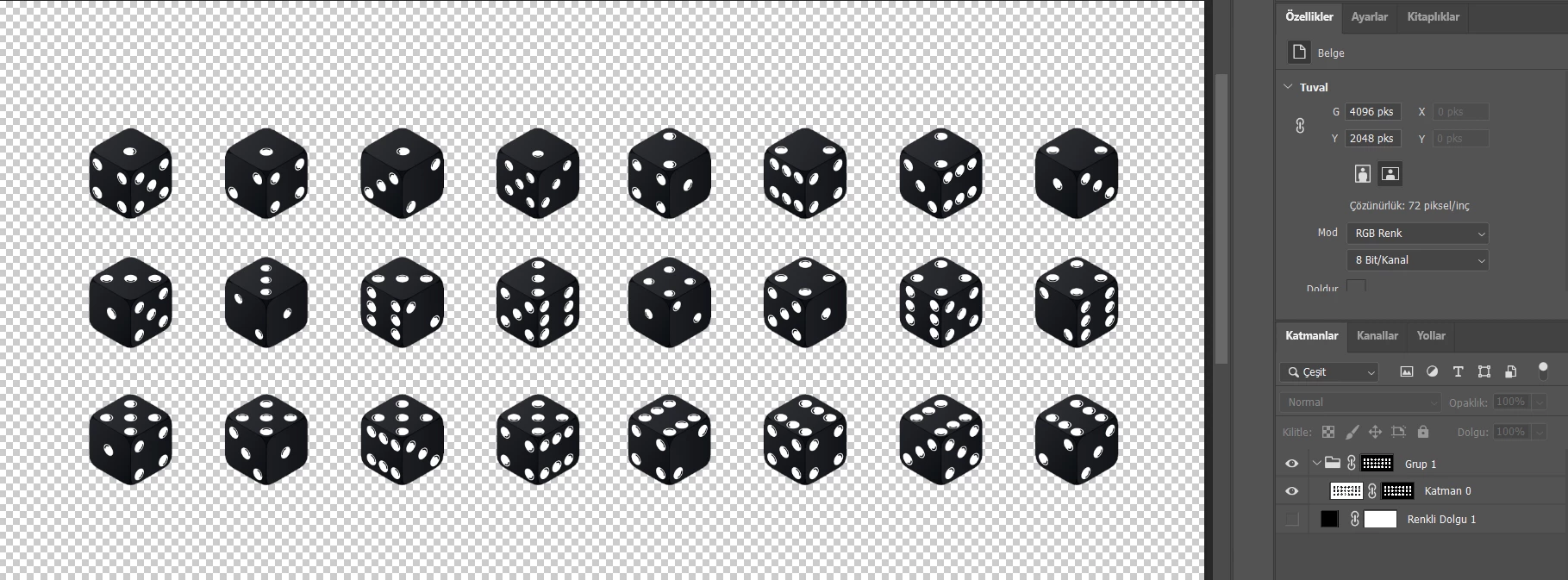My second question, I realized that the original dice image is 24 bit. When I imported the image to Photoshop, it was somehow created for 8 bit. When I attempt to duplicate it into a project that has higher bit; the image becomes distorted. Even though this is a black and white image for now, I would add patterns onto the dices. Do you think that 8 bit decision decreases the image quality in the game? Is it too late to change it?