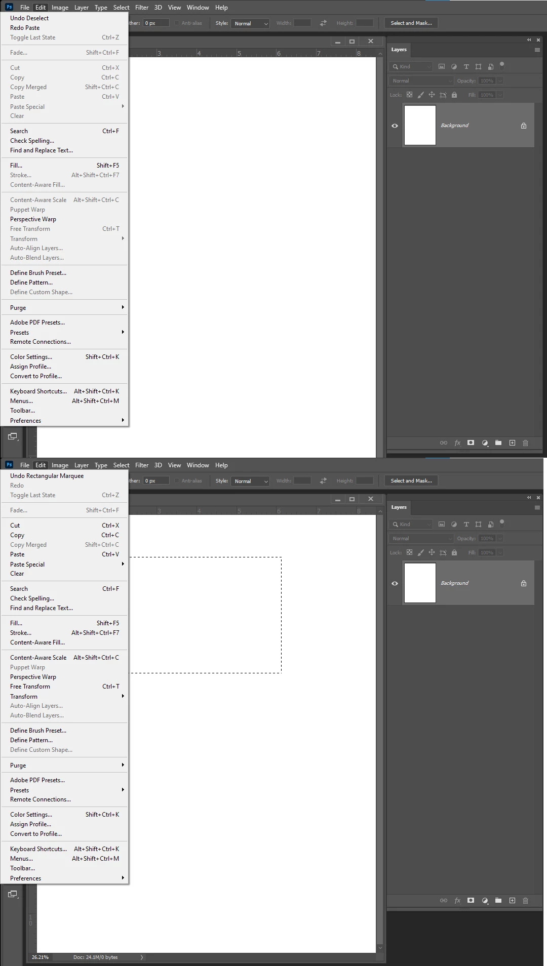 Some features are not always available for use.  When a features can not be user Photoshop will often gray out menu items.  Look here in the background layer edit menu you see many item are grayed out. However, if you have something in the clipboard have are active selection the backgrounds edit menu will have fewer things grayed out.