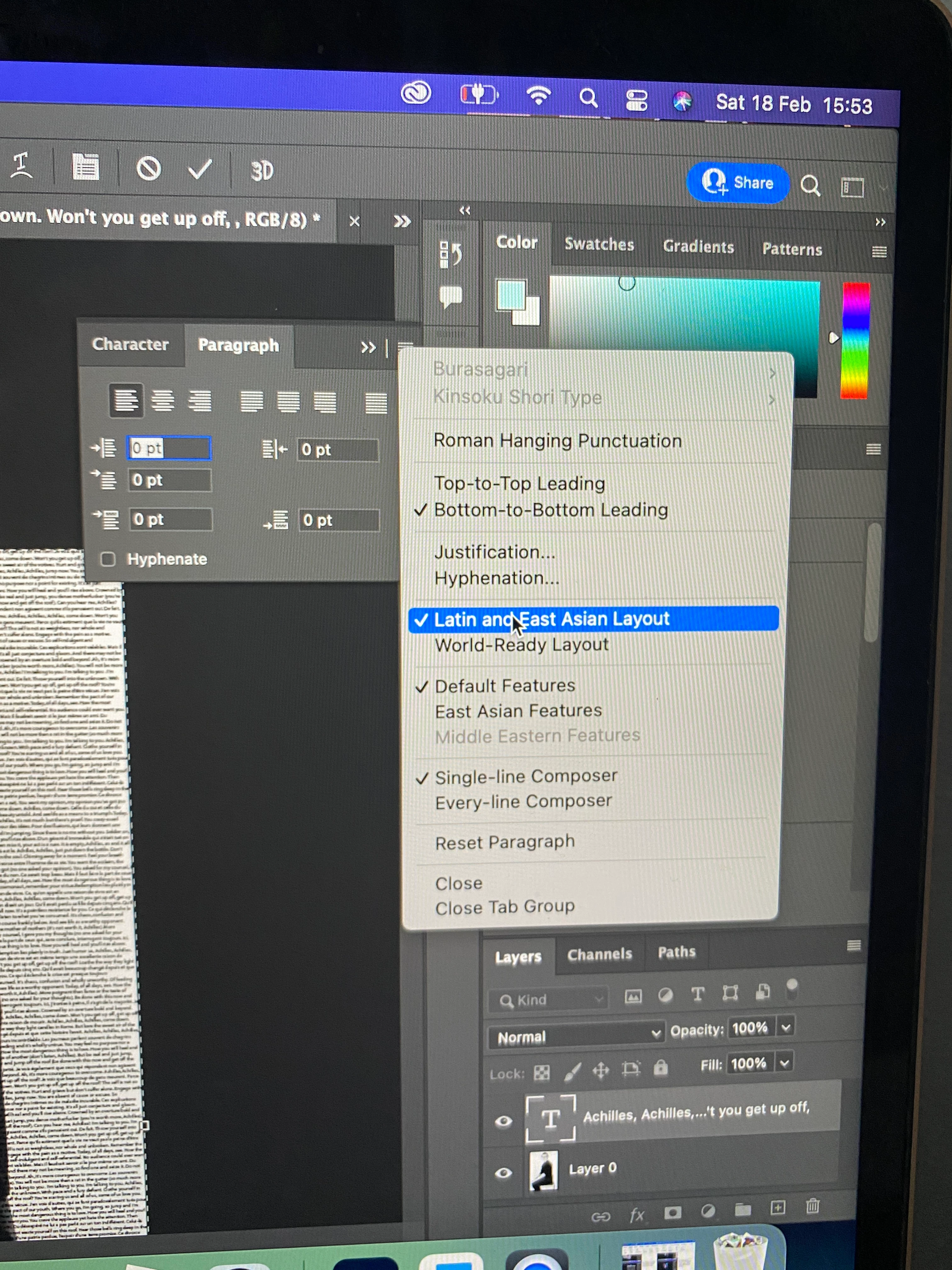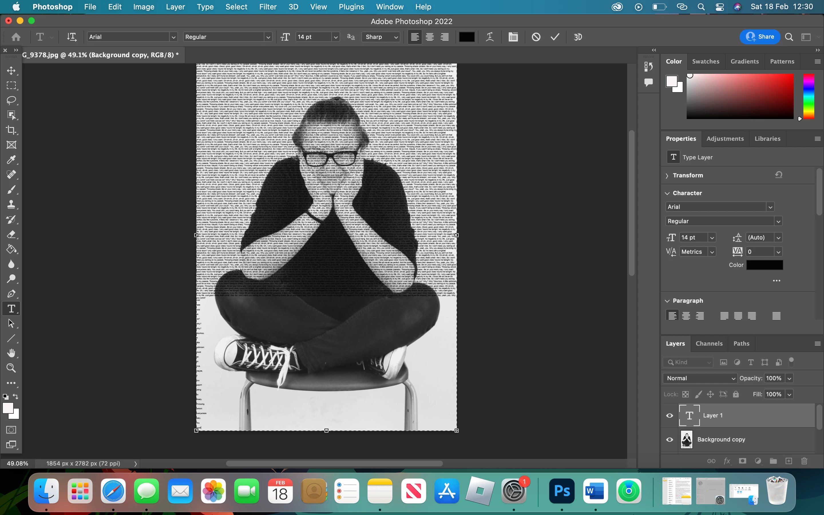 I am currently working on this image on my Macbook, and I need the text to cover the whole image. After a certain point the text moves to the side and if I try to intact with it, causes photoshop to freeze. The text has to be this size as I need to be able to see the image behind after clipping mask.