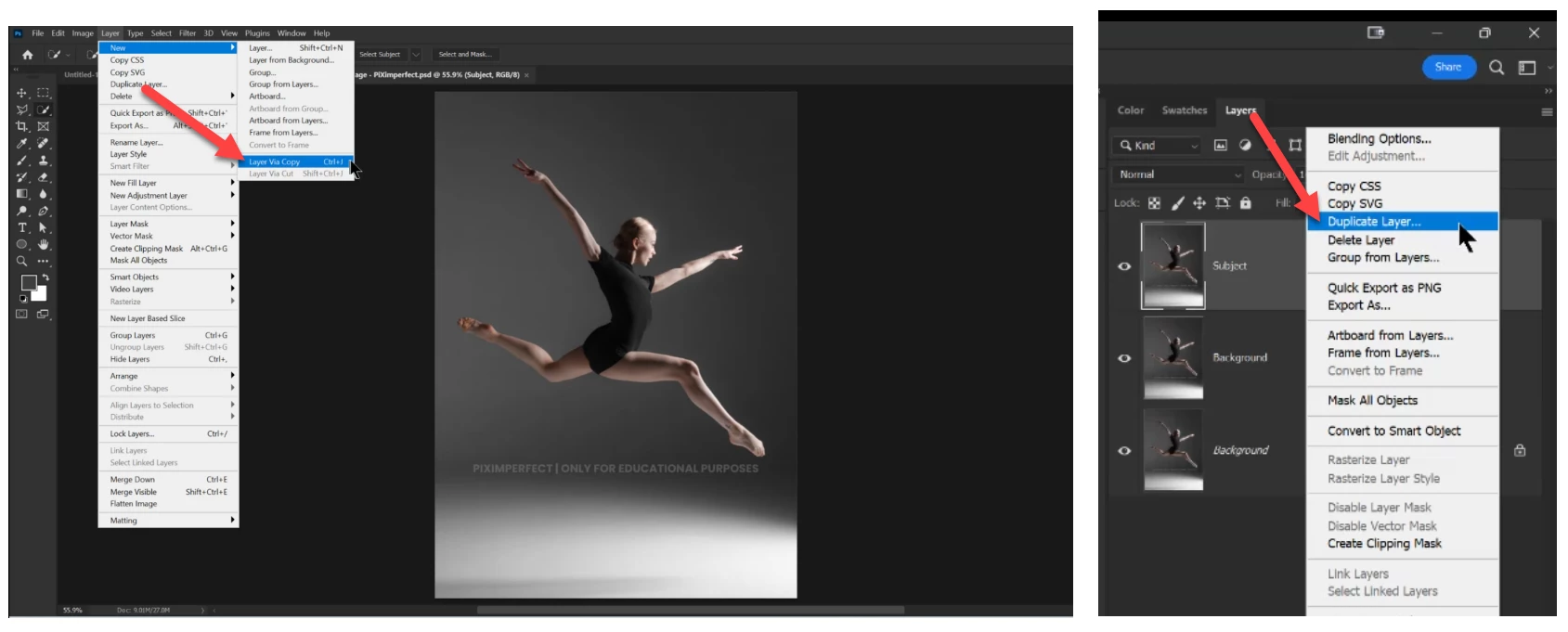 You can also drag and drop a layer to the new layer icon on bottom of layers palette duplicate.