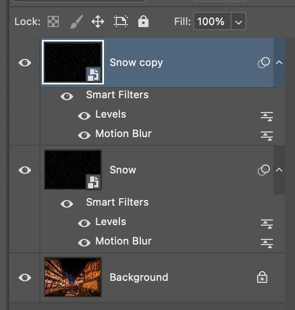 I was trying to create a snow effect in my edited photo, here is my screen shot of the layers: