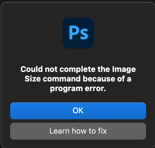 Noticed a problem on the latest Apple silicon version of Photoshop. Using the 'Image Size' tool no longer works and always creates this error promt. This happens on all files and filetypes and is not fixed by restarting photoshop or rebooting my Macbook.