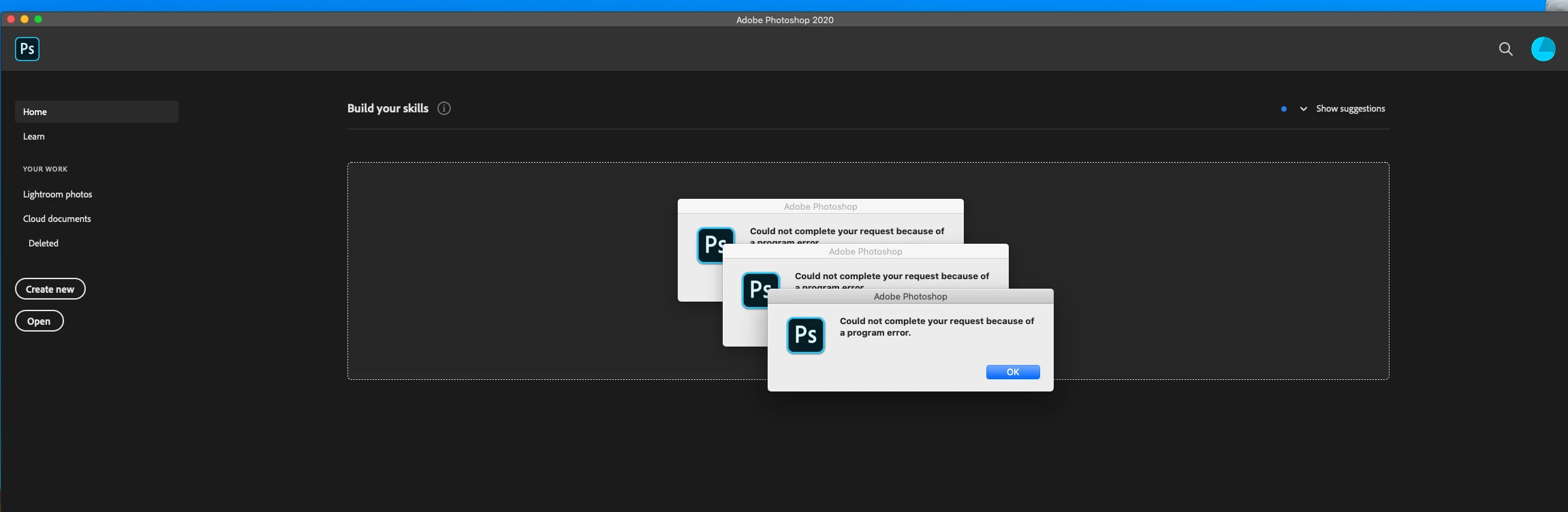 could not complete your request because of a program error Photoshop 2020 Mac OS Catilina