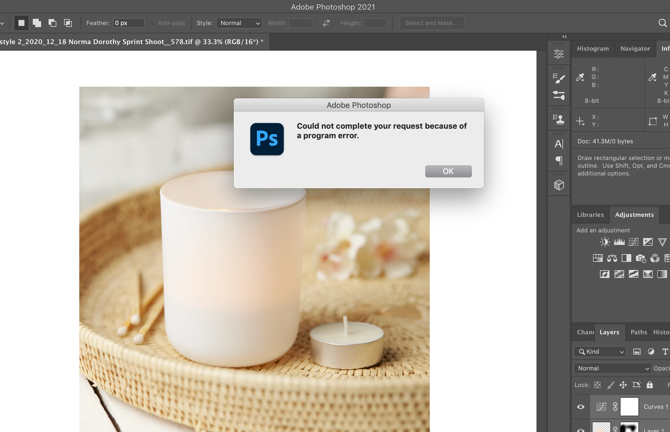 Really hoping for a bit of advice here. I installed the latest photoshop 2 weeks ago, and everything has been running fine up until this evening. I can open images, work on them, but then when I try and flatten the layers or simply save the image, I am getting the error message: "Could not complete your request because of a program error."