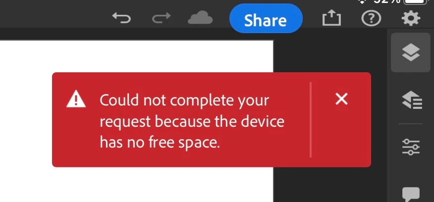 Was using the brush tool but suddenly got told that my device has no free space. I use an ipad; checked my system storage in both in adobe and the ipad itself: both have space.
