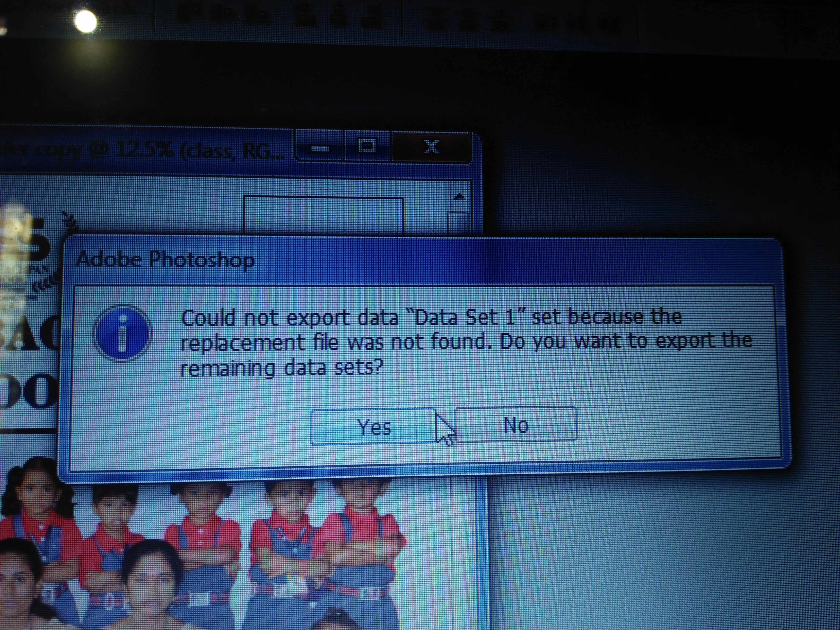 Upon clicking the export button, a dialogue box poops-up with an error message "Could not export the data "data-set name" set because the replacement file was not found".