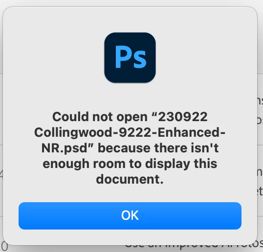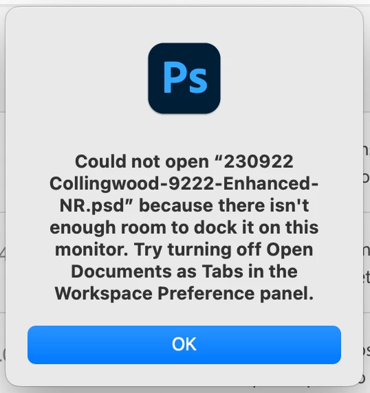 I downloaded and installed Ps 2024 (v25) and I have received the error "Could not open "filename.psd" because there isn't enough room to dock it on this monitor. Try turning off Open Documents as Tabs in the Workspace Preference panel. Which I did.