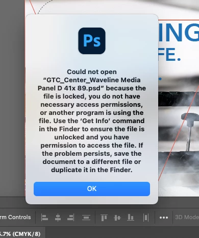 Could not open “RAM5DC_LH_edit.psd” because the file is locked, you do not have necessary access permissions, or another program is using the file. Use the ‘Get Info’ command in the Finder to ensure the file is unlocked and you have permission to access the file. If the problem persists, save the document to a different file or duplicate it in the Finder.