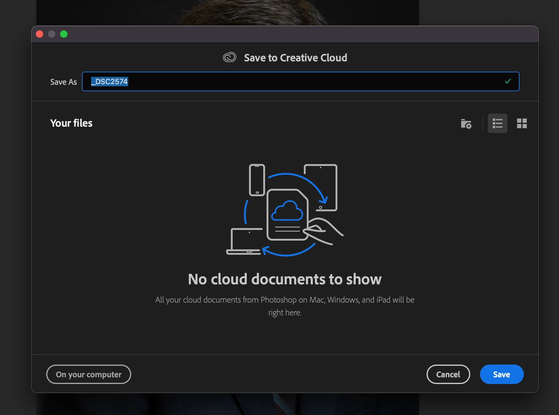 When I try to save I get the screen below.  I click on the button on the bottom left to "on your computer" - this is new today and I have never seen this before now.  I do not want to save the Creative Cloud. I just want to save to my drive. I have a separate backup. So I do not need the creative cloud.