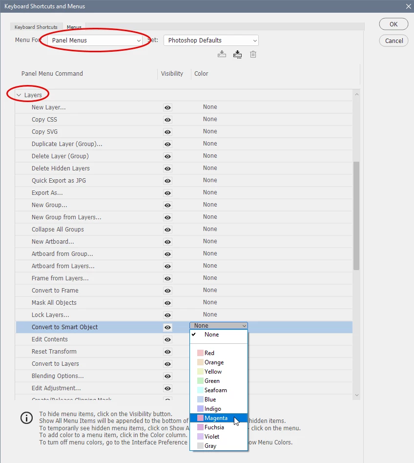 couleur dans le menu de la fenêtre calque