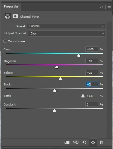 cyan channel, color value cyan=100, magenta=10, yellow=25, black=2