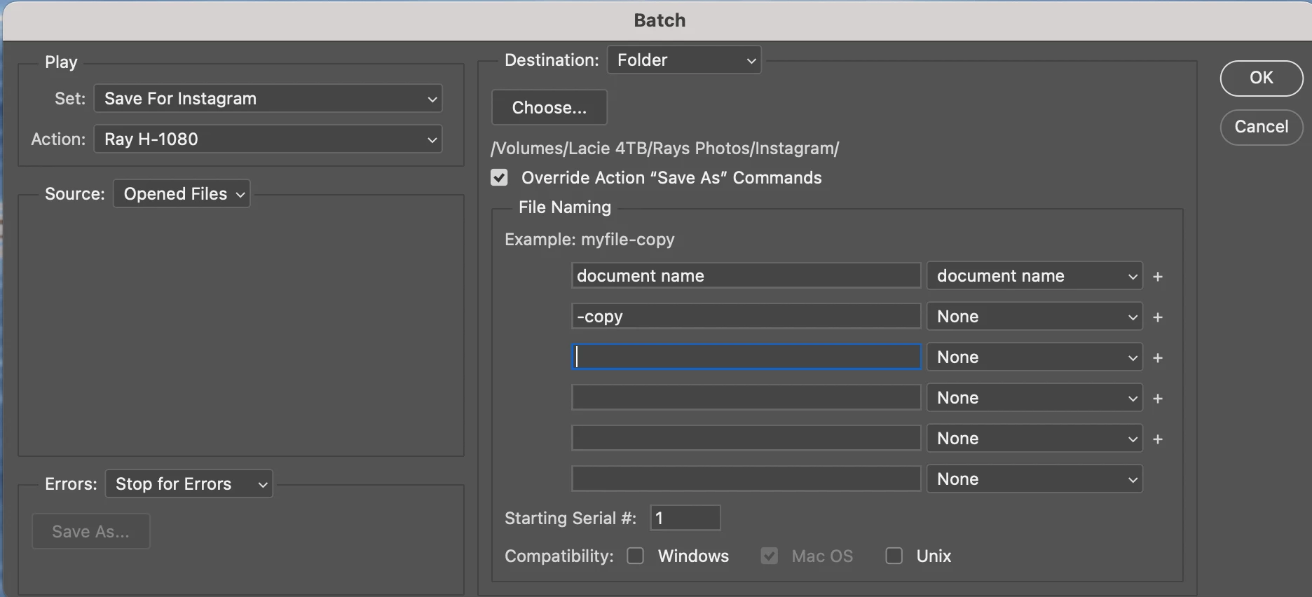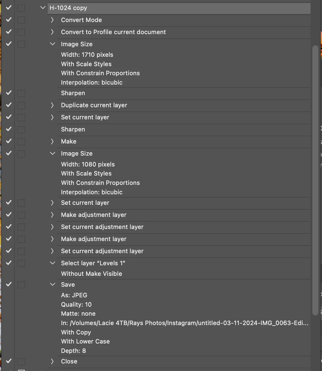 When I send RAW images to PS from Lightroom classic I have several Actions I created which allow me to save a small jpeg of the image as a copy for Instagram into a specific folder and then close the image from PS without saving. This has worked for many years. (I do realise that the RAW images sent from LR to PS are not RAW anymore and that they are converted to TIFF's for editing). Now when I use the same Action the copied image is overwritten every time with the same file name! I have experimented with creating new actions to save a copy of a RAW image to a smaller Jpeg for Instagram by selecting ‘save a copy’ and changing TIFF to Jpeg, but every time the last image that was saved as a Jpeg is replaced by the latest file image I am saving when i run the action I have just created, so something has changed in this version of PS 26.4.1 which does not allow me to create an action to save copies of image files with different filenames without overwriting and replacing the image that was last saved! Hopefully, you understand my explanation. Can you assist in helping me create an Action which will save several images as individual new ‘copy’ files and not replacing or overwriting the previous file?