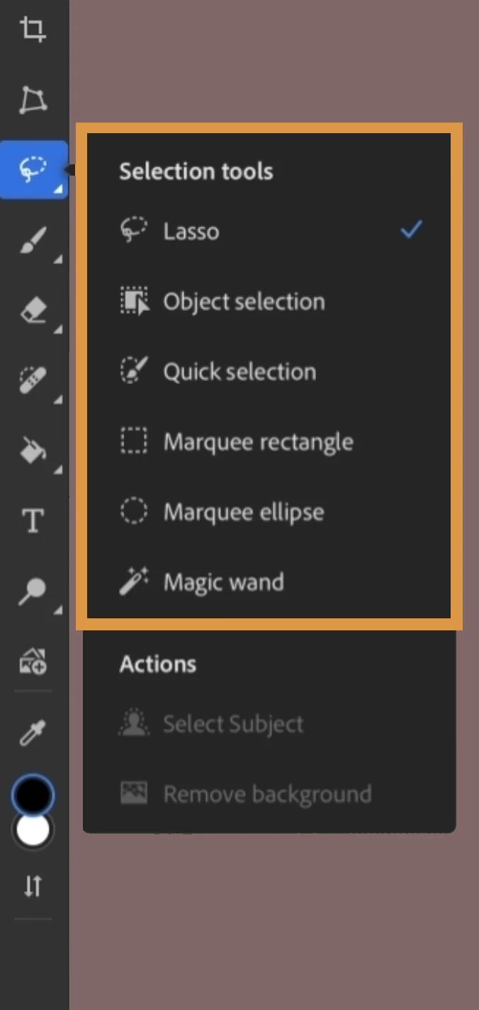 - Use a selection tool such as the Lasso tool, Object selection tool, or one of the other tools to make a selection around a desired object or an area in your image. You can double-tap or long-press the active selection tool from the toolbar to bring up additional Selection tools.