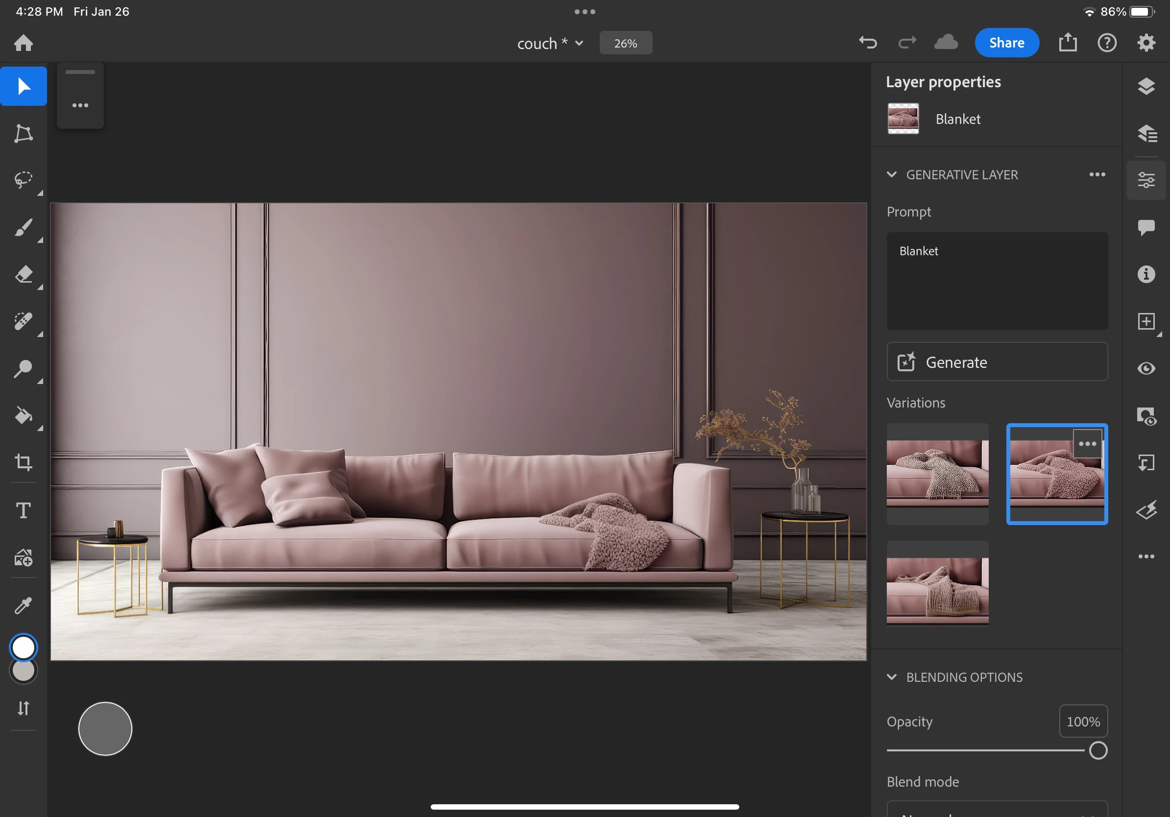 To generate additional variations, modify the text prompt and tap Generate in the Properties panel.