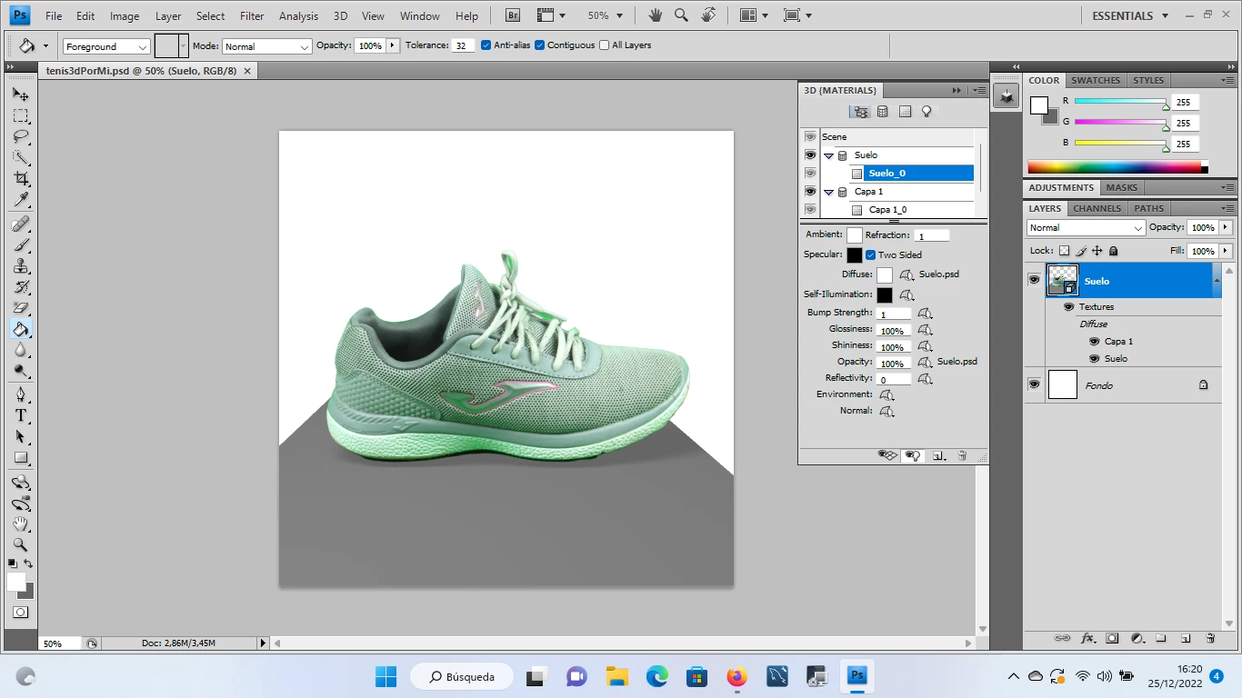 hi, i'm trying to create a shadow on a shoe. For this I use adobe photoshop cs4, with 3d features. I create a plane on the floor and a point of light, and the shadow is created. But the problem is that said plane (the one on the floor) has to have a color to create the shadow. If I put it completely white, the shadow is not created. And the question is can I somehow create the shadow with the totally white floor plane.