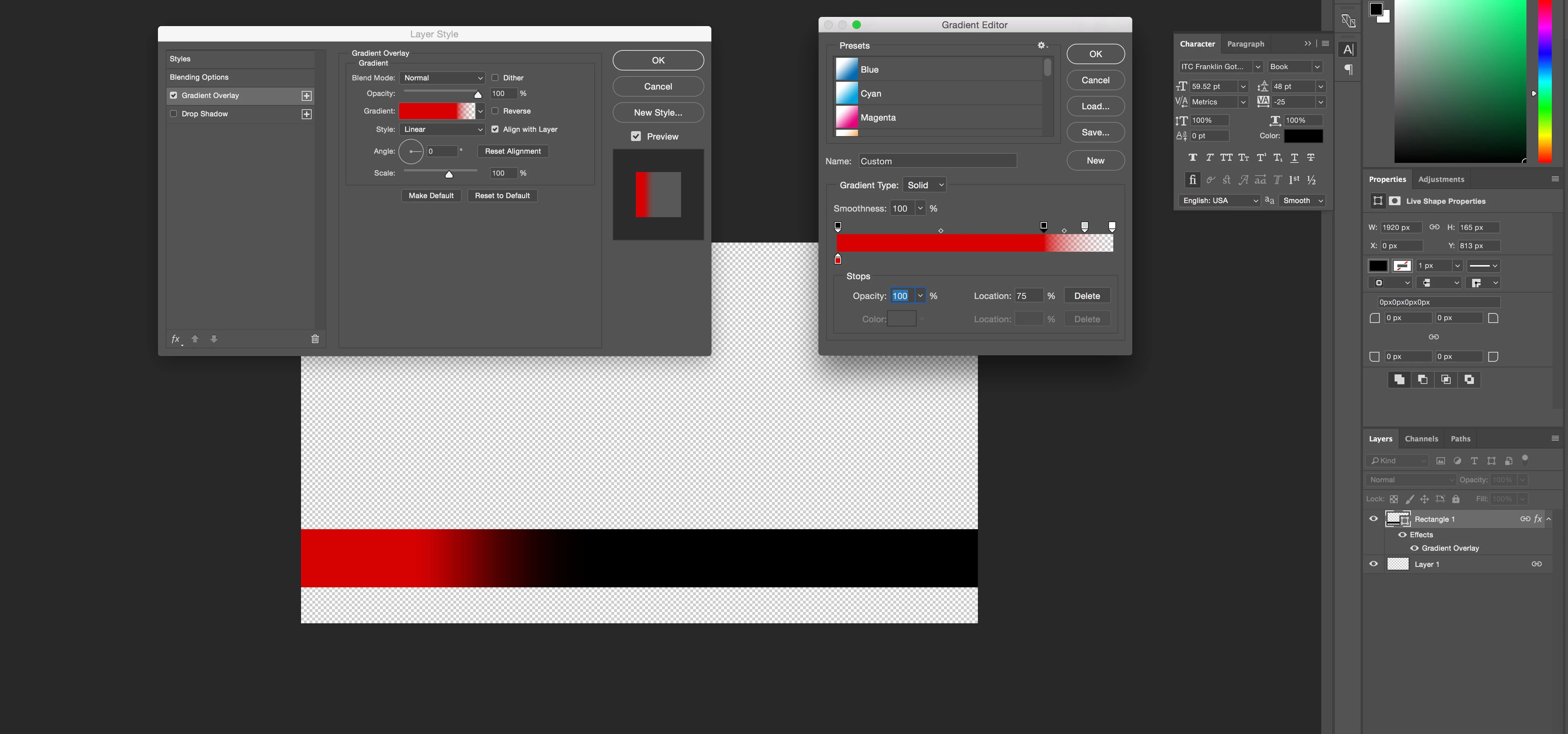 I'm making an aston (Name tag/strap/whatever, to edit in photoshop and export to put into Premiere Edits. I'm making a simple black rectangle, that about 3/4 down I want to dissolve into transparency. I am selecting the rectangle I have created and am editing the stops so when it reaches 75% it will start to fade, but whenever I edit these stops nothing changes.
