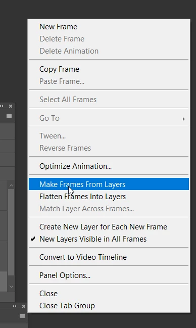 I am trying to create an animated GIF using a series of photos. I am using the guide from Create animated GIFs | However when I get to the Step 3 (Convert layers into animation frames) When I click on the right menu of the Timeline the options I see are different than the ones shown in the guide.