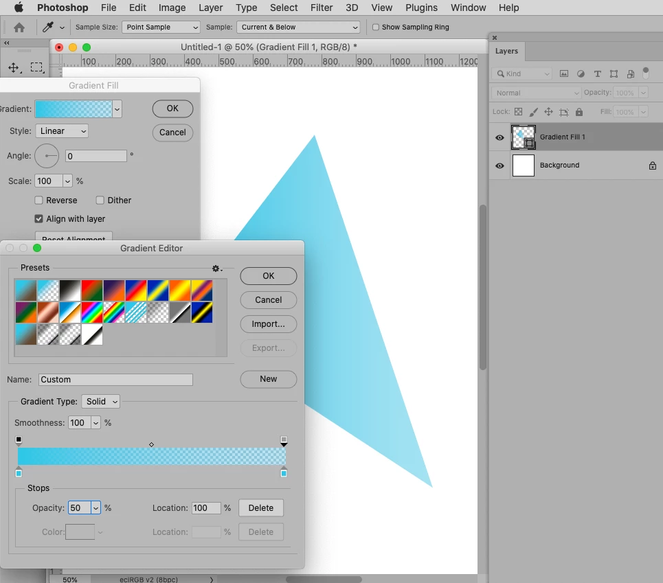 I'm stuck getting this to work... I have a triangle shape which I need to fade out exactly 50% across, so it is solid for the first half, then the second half fades out to nothing. I have my shape, apply a layer mask and use the gradient tool but it's not giving the right result. Bit of a novice but I can find my way around...