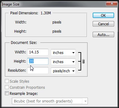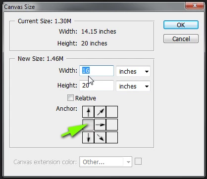 Image - Image Size, UNcheck Resample Image, and make the image 20 inches tall. Then Choose Image - Canvas Size, and expand to the right as follows: