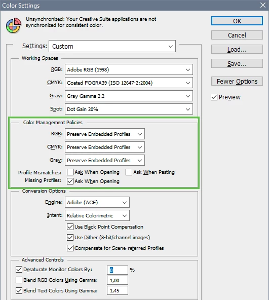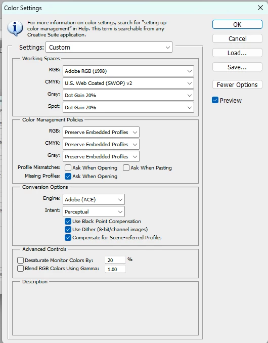 2. The document should have a colour profile which it sounds like yours does. That does not have to match the Photoshop default which is just there for when you start a new empty document with File - New.