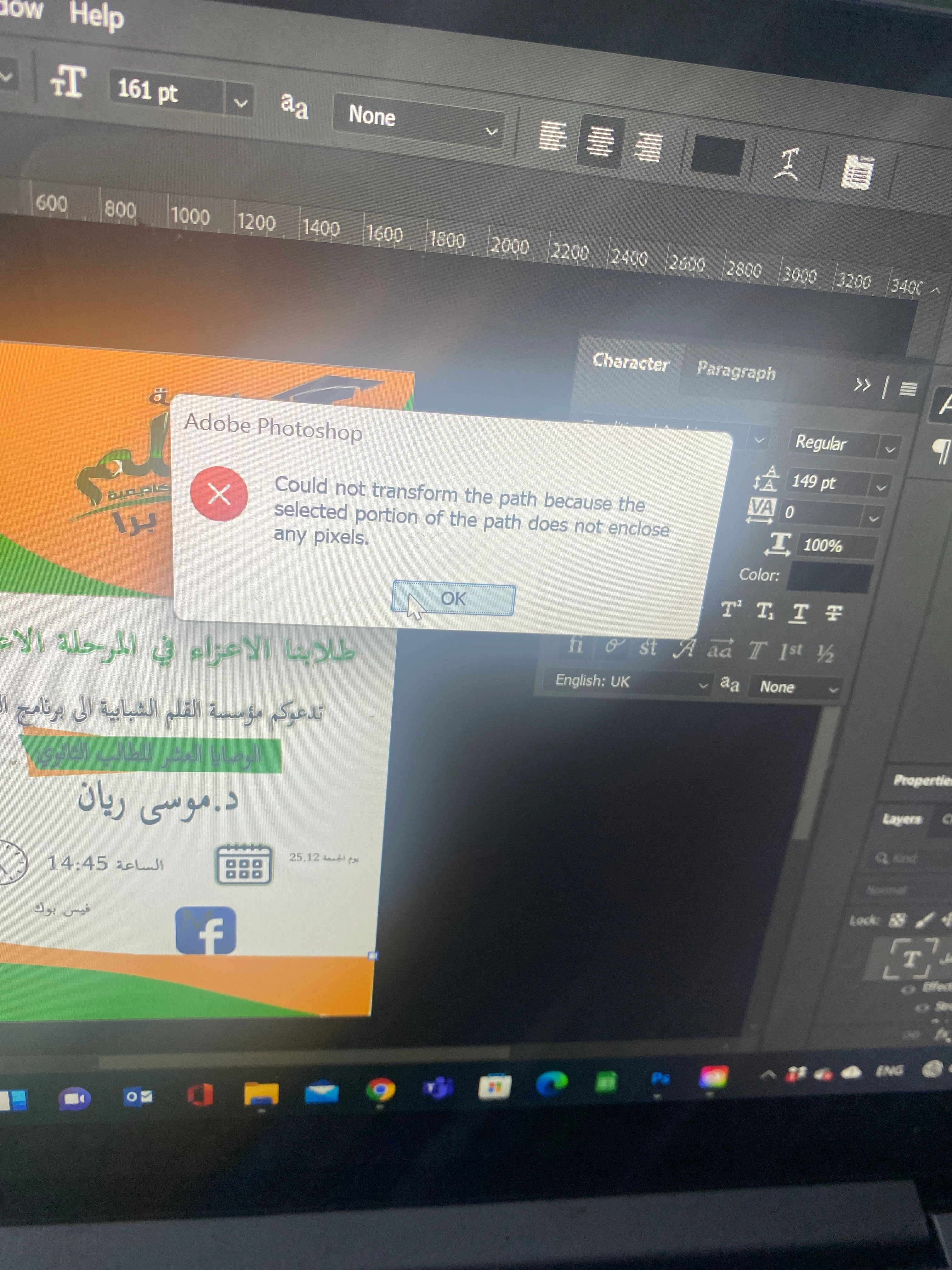 Mmosa2352873317xxParticipantForum|Forum|4 years agoMarch 10, 2022QuestionCtrl T doesn't workForum|Forum|4 years agoMarch 10, 20221 reply357 viewsHi, Somtimes I try to work with ctrl T and is not working for me . any one can help me ? When I use ctrtl T I get this messsage " could not transform the path because the selected portion of the path does not enclose any pixels" Windows