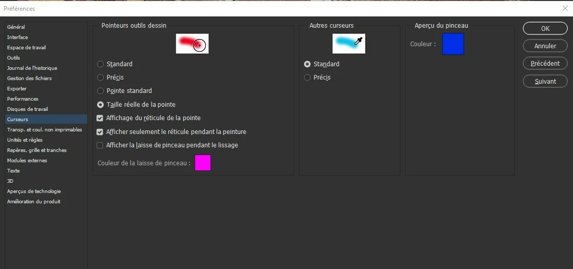 The color is no longer displayed in the cursor when I use the quick selection for example. It was very useful to visualize the size or the hardness of the tool. However in the preferences of the cursor the color is validated.It was working fine until yesterday.